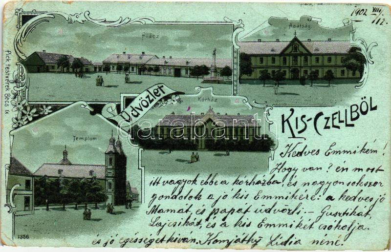 Leírás: Kiscell, Celdömölk; Kórház, apátság, piac, templom, Pick Testvérek kiadása, Art Nouveau, litho (EB)