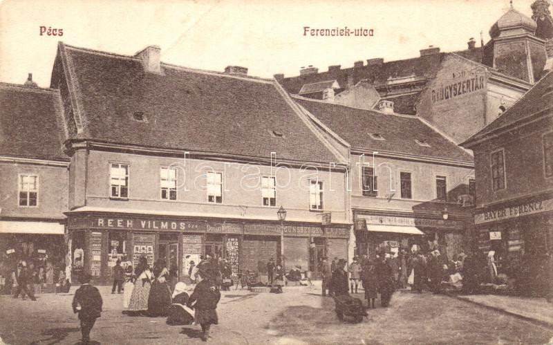 Pécs, Ferenciek utca, Reeh Vilmos, Bayer Ferenc és Günsberger Lajos ke... https://www.darabanth.com/hu/271-Gyorsarveres/271.0/Kepeslapok/Magyarorszag~200006/Pecs-Ferenciek-utca-Reeh-Vilmos-Bayer-Ferenc-es-Gunsberger-Lajos-kereskedesei-b~II1369948