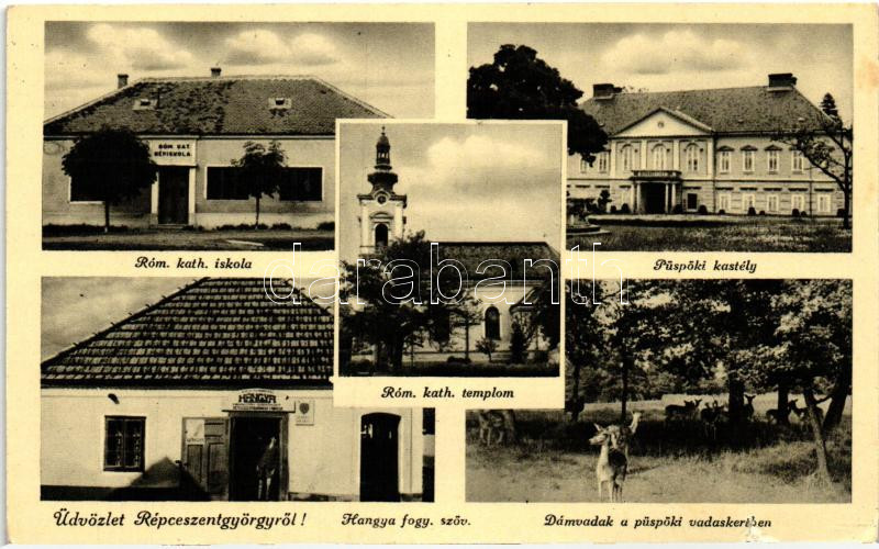 Leírás: Répceszentgyörgy, Hangya, Római katolikus iskola és templom, Dámvadak a püspöki vadaskertben, Püspöki kastély (b)