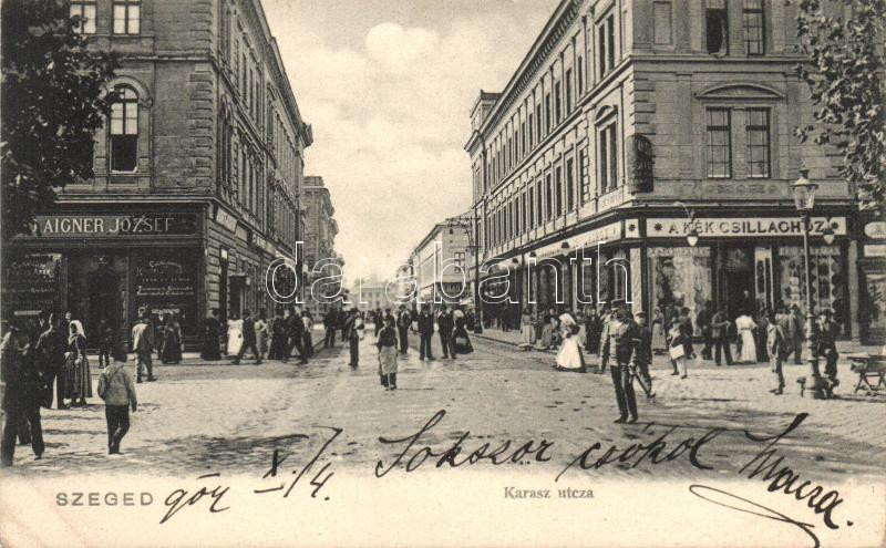Szeged, Kárász utca, Aigner József kereskedése, 'A Kék Csillaghoz... https://www.darabanth.com/hu/271-Gyorsarveres/271.0/Kepeslapok/Magyarorszag~200006/Szeged-Karasz-utca-Aigner-Jozsef-kereskedese-A-Kek-Csillaghoz-elnevezesu-uzlet-fl~II1370404