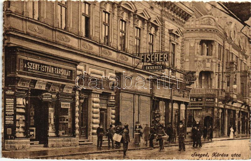 Szeged, Kárász utca, Fischer ékszerész, Szent István Társulat könyvkiadóhivatal, Sczwarcz Manó férfi szabó, Zóna Bazár, Haas Fülöp és fiai üzlete; kiadja a Szent István Társulat
