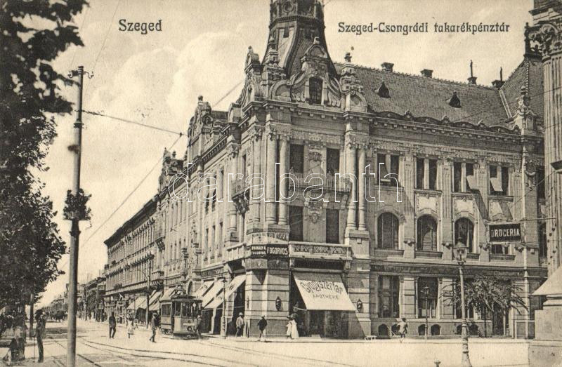 Leírás: Szeged, Szeged-Csongrádi takarékpénztár, gyógyszertár, Dr. Király K. fogorvos, villamos