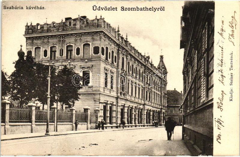 Szombathely, Szabária kávéház, kiadja Steiner testvérek (EK) https://www.darabanth.com/hu/271-Gyorsarveres/271.0/Kepeslapok/Magyarorszag~200006/Szombathely-Szabaria-kavehaz-kiadja-Steiner-testverek-EK~II1376278