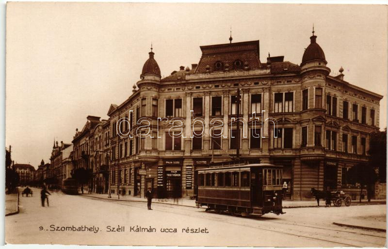 Leírás: Szombathely, Széll Kálmán utca, villamos, Pauk Testvérek üzlete, fodrászszalon, kiadja Dukesz Jenő