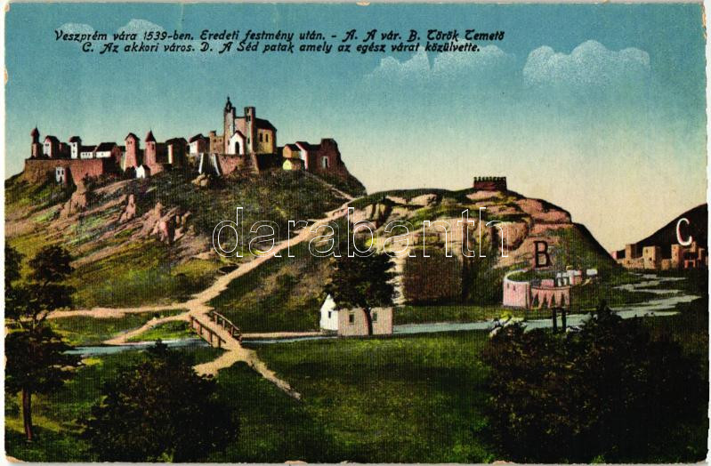 Leírás: Veszprém, a vár 1539-ben, A vár, Török Temető, Az akkori város, A Séd patak amely az egész várat közülvette (kopott sarkak / worn edges)