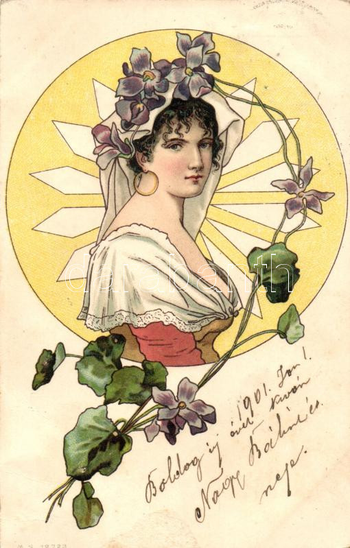 Leírás: Lady with flowers, M. S. 12723 litho (ragasztónyom / gluemark)