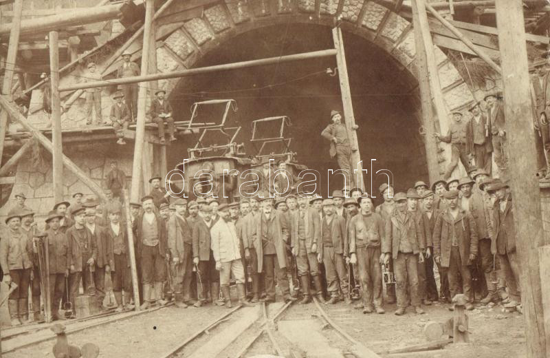1905 Hrusica, Birnbaum; Birnbaumer Seite, Karawankentunnel, Stollenbahnlokomotiven / Predor Karavanke / Construction of the Karawanks railway tunnel, construction workers, tunnel railway locomotives, group photo (EK)