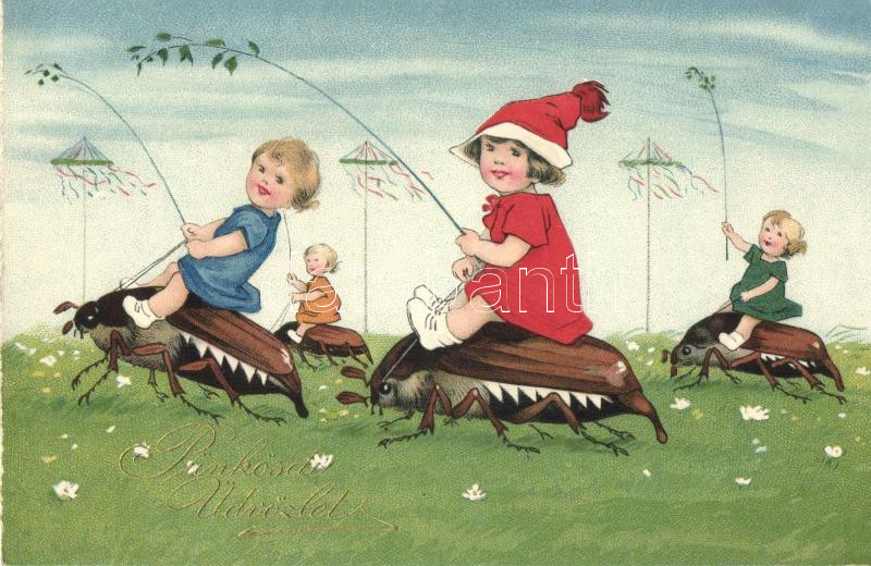 Leírás: Pünkösdi Üdvözlet / Pentecost, kids riding on may bugs. Meissner & Buch, Kunstkarte No. 3060. litho
