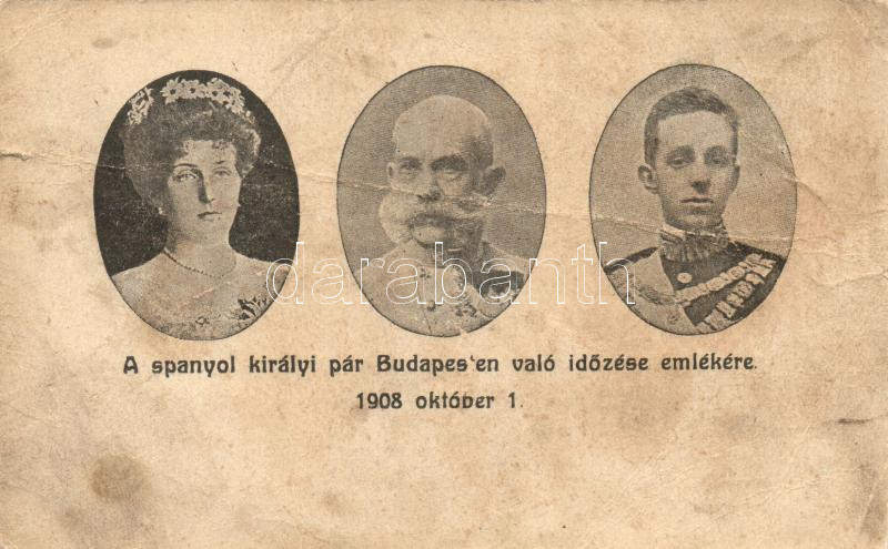1908 'A spanyol királyi pár Budapesten való időzése emlékére', Ferenc József, XIII. Alfonz, Viktória Eugénia, kiadja Lőbl Dávid és fia / Spanish royal couples visit, Alfonso XIII of Spain and Victoria Eugenie of Battenberg (b)