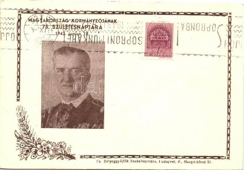 1943 Horthy Miklós 75. születésnapja emlékére, kiadja a Bélyeggyűjtők ... https://www.darabanth.com/hu/271-Gyorsarveres/271.0/Kepeslapok/Uralkodo-Politikus~200092/1943-Horthy-Miklos-75-szuletesnapja-emlekere-kiadja-a-Belyeggyujtok-Szakkonyvtara-Istv~II1370243