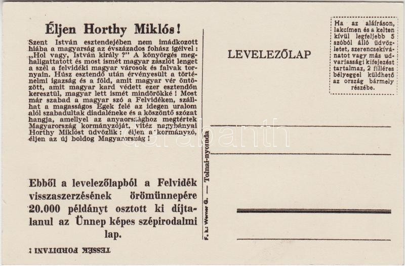 Horthy Miklós, Felvidék visszaszerzésének örömünnepére kiadott lap https://www.darabanth.com/hu/271-Gyorsarveres/271.0/Kepeslapok/Uralkodo-Politikus~200092/Horthy-Miklos-Felvidek-visszaszerzesenek-oromunnepere-kiadott-lap~II1317123