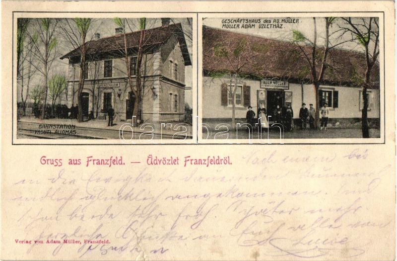 Leírás: Ferenchalom, Franzfeld, Kacarevo; Vasútállomás, Müller Ádám üzlete, kiadja Müller Ádám (r)