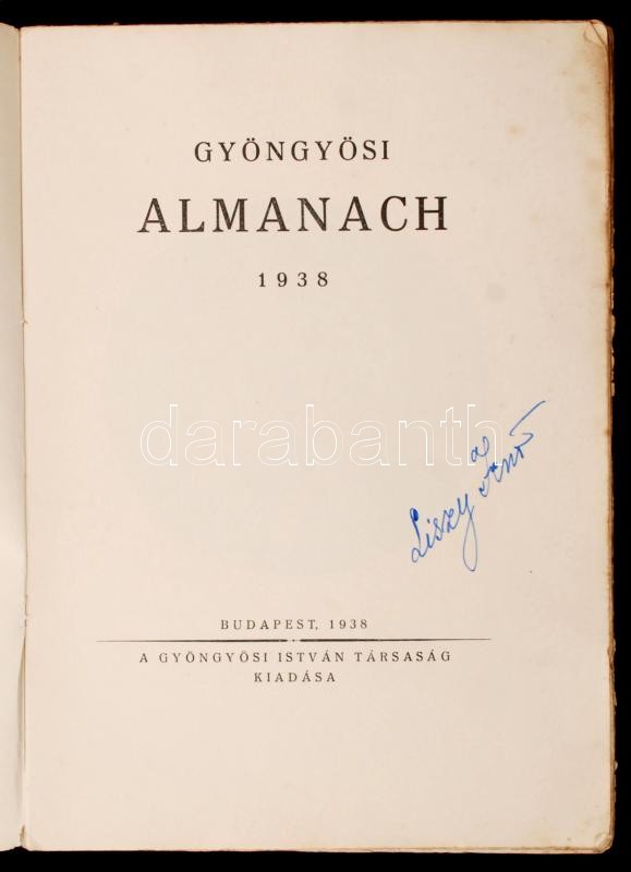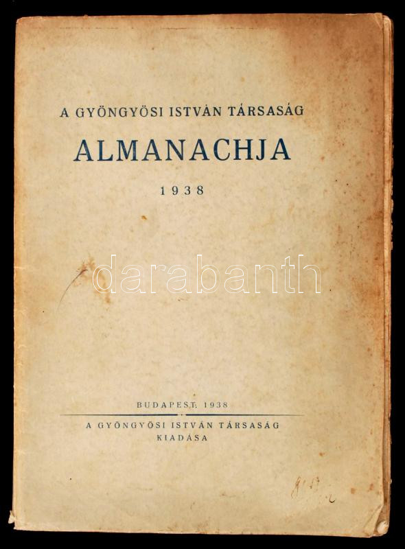 A Gyöngyösi István Társaság Almanachja. Budapest, 1938, Gyöngyösi István Társaság, 219 p. Fűzött papír kötés. A borítója foltos, gyűrött, viseltes. A lapok foltosak. A lapszélek gyűröttek. A kötése sérült. A borító részben elvált a gerincétől.