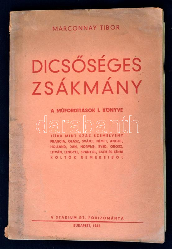 Marconnay Tibor: Dicsőséges zsákmány. A műfordítások I. könyve. Kiadói... https://www.darabanth.com/hu/271-Gyorsarveres/271.0/Konyvek/Konyvek-Egyeb-ritkasagok~46/Marconnay-Tibor-Dicsoseges-zsakmany-A-muforditasok-I-konyve-Kiadoi-papir-kotesben~II1335757