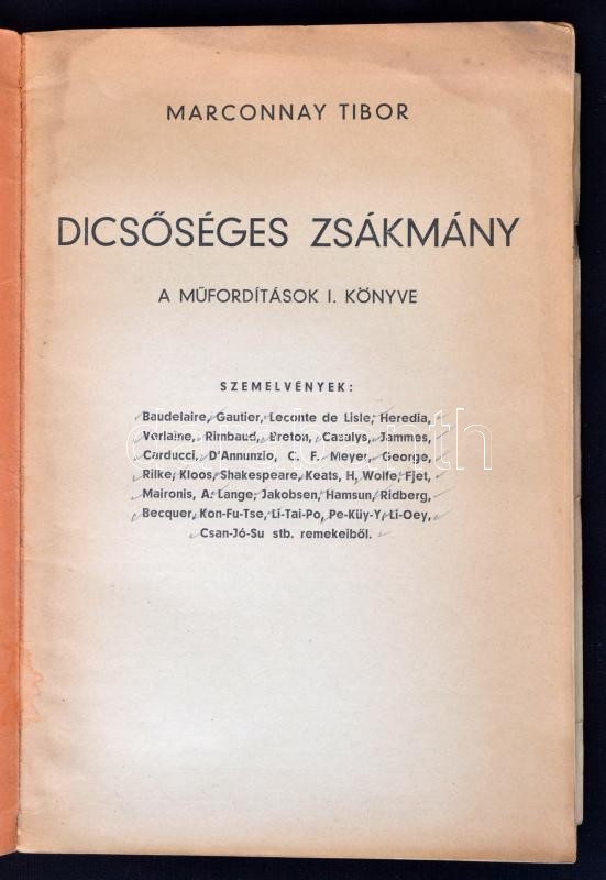 Leírás: Marconnay Tibor: Dicsőséges zsákmány. A műfordítások I. könyve. Kiadói papír kötésben.