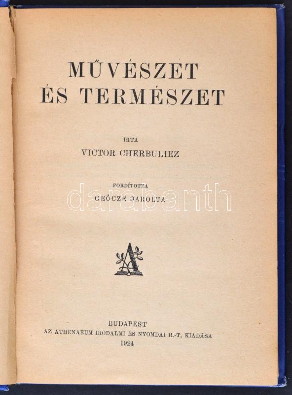 Victor Cherbuliez: Művészet és természet. Budapest, 1924, Athenaeum. I... https://www.darabanth.com/hu/271-Gyorsarveres/271.0/Konyvek/Konyvek-Epiteszet-muveszet~37/Victor-Cherbuliez-Muveszet-es-termeszet-Budapest-1924-Athenaeum-Illusztralt-kiadoi-egesz~II1370342