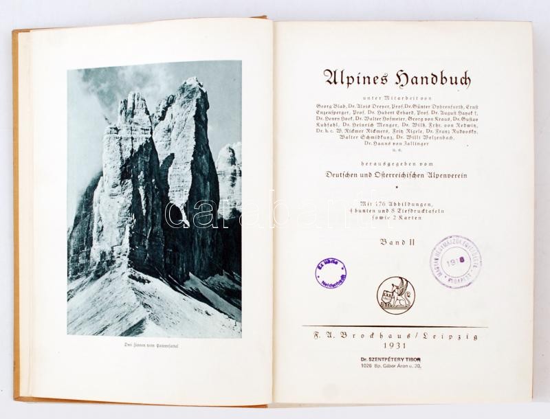 Georg Blab et alii: Alpines Handbuch. Mit 176 Abbildungen, 4 bunten und Tiefdruchtafeln so wie 2 karten. Leipzig, 1931, F.U. Brodhaus. Band II. Kiadói egészvászon kötésben.