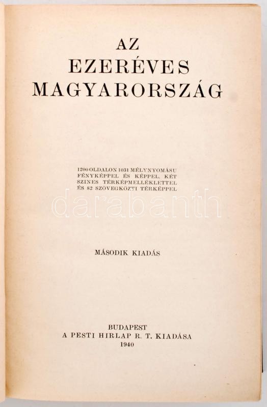 A Pesti Hírlap Könyvtára: Az ezeréves Magyarország. 1200 oldalon 1031 mélynyomású fényképpel és képpel, két színes térképmelléklettel és 82 szövegközti térképpel. Budapest, 1940, A Pesti Hírlap Rt, 1200 p. Második kiadás. Kiadói aranyozott egészvászon kötés, jó állapotban.