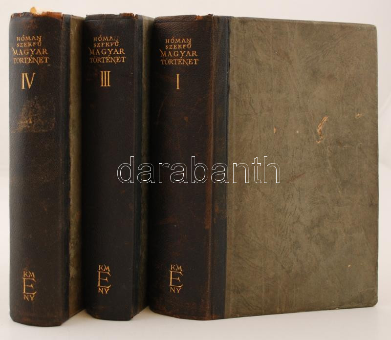 Hóman Bálint, Szekfű Gyula: Magyar történet. I, III., IV. kötet. Bp., 1939, Királyi Magyar Egyetemi Nyomda. Hatodik kiadás. Kopottas, sérült kiadói félbőrkötésben.