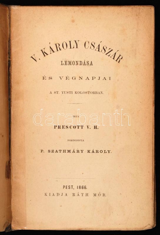 V.H. Prascott: V. Károly császár lemondása és végnapjai a St. Yusti kolostorban. Ford. Szathmáry Károly. Pest, 1866, Ráth Mór. VI+196 p. Kiadói papírkötésben, a gerincét ragasztószalaggal megerősítették..