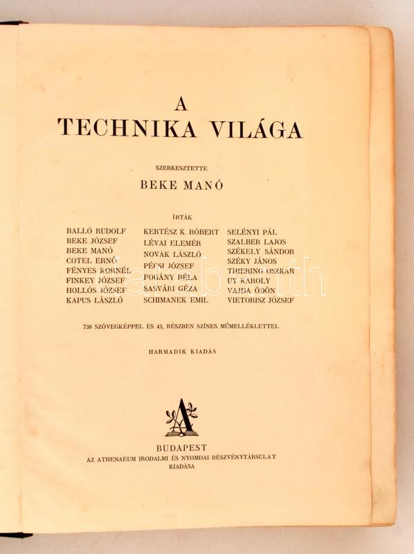 Beke Manó (szerk.): A technika világa. Budapest, é.n., Athenaeum Irodalmi és Nyomdai Részvénytársaság, 816. Harmadik kiadás. Kopottas kiadói egészvászon kötés.