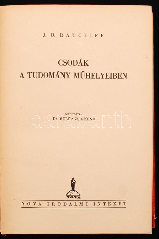 J. D. Ratcliff: Csodák a tudomány műhelyeiben. Bp., 1943, Nova. 253 p.... https://www.darabanth.com/hu/271-Gyorsarveres/271.0/Konyvek/Konyvek-Tudomany-es-technika~40/J-D-Ratcliff-Csodak-a-tudomany-muhelyeiben-Bp-1943-Nova-253-p-Kiadoi-felvaszonkotes~II1322899
