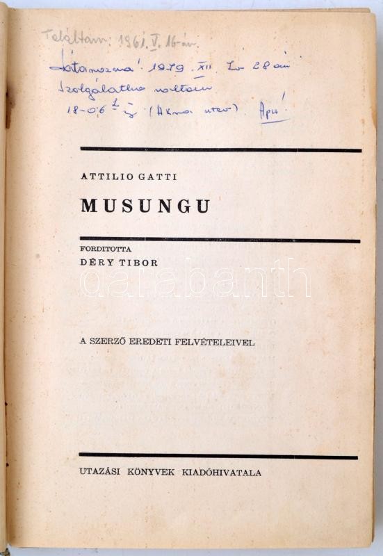 Attilio Gatti: Musungu. Fordította Déry Tibor. A világjárás hősei. Budapest, É.N., Utazási könyvek kiadóhivatala. Egésvászon kiadói borítóban, 204 p.