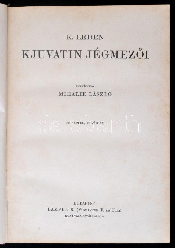 K. Leden: Kjuvatin jégmezői. Magyar Földrajzi Társaság Könyvtára. Fordította: Mihalik László. Budapest , é.n., Lampel R. (Wodianer F. és Fiai), 244 p. Kiadói aranyozott egészvászon kötésben. A borítója kopottas, foltos.