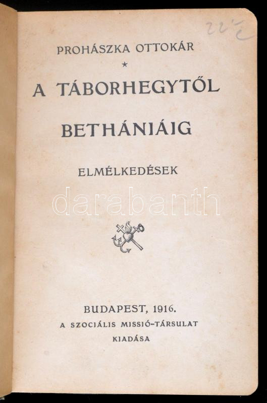 Leírás: Prohászka Ottokár: A Táborhegytől Bethániáig. Elmélkedések. Bp., 1916, Szociális Missió-Társulat. Kopott vászonkötésben, egyébként jó állapotban.