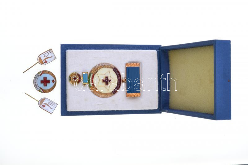 Leírás: DN "Kiváló véradó" zománcozott fém kitüntetés, dísztokban, miniatűrrel + "Vöröskereszt - Érdemes munkáért" + 2db kitűző 10 illetve 15 véradásért T:2