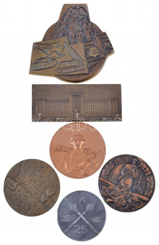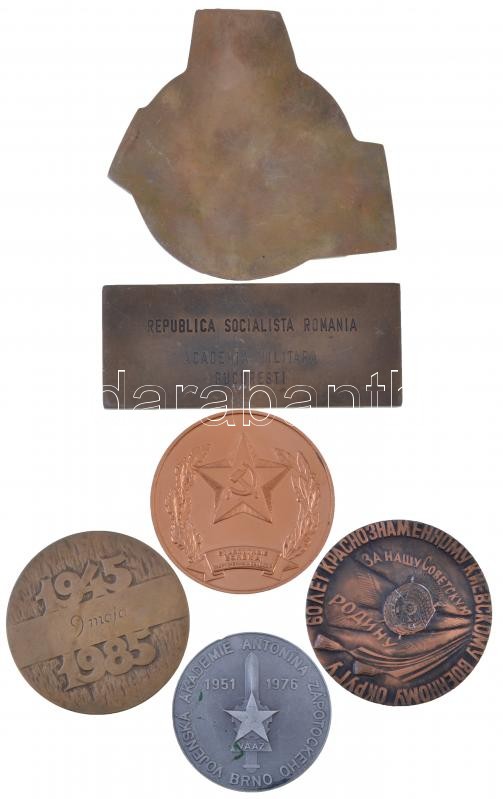 Vegyes: 6db klf katonai témájú plakett, közte Románia DN "Román Szocialista Köztársaság - Katonai Akadémia" Br plakett (48x114mm), Lengyelország 1985. "A győzelem 40. évfordulója / 1945 május 9. - 1985" kétoldalas Br plakett (70mm) T:2,2-