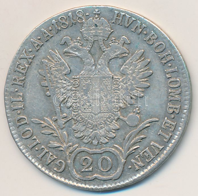Aust... https://www.darabanth.com/hu/271-Gyorsarveres/271.0/Numizmatika/Kulfoldi-fem-es-ezustpenzek~300013/Ausztria-1818A-20kr-Ag-I-Ferenc-6-48g-T2-patina--Austria-1818A-20-Kreuzer-Ag-Franz-I-6-48g~II1377049