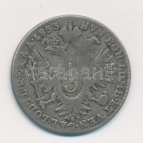 Austri... https://www.darabanth.com/hu/271-Gyorsarveres/271.0/Numizmatika/Kulfoldi-fem-es-ezustpenzek~300013/Ausztria-1833A-3kr-Ag-II-Ferenc-1-59g-T2-3-k--Austria-1833A-3-Kruzer-Ag-Franz-II-1-59g-C~II1376997