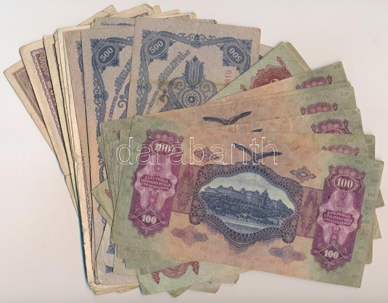 Leírás: 1930. 20P + 1932. 50P (5x) + 1945. 50P + 1930. 100P (8x) + 1945. 100P (10x) + 1945. 500P (9x) T:III,III-