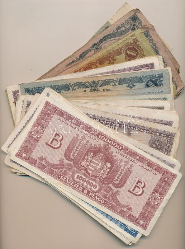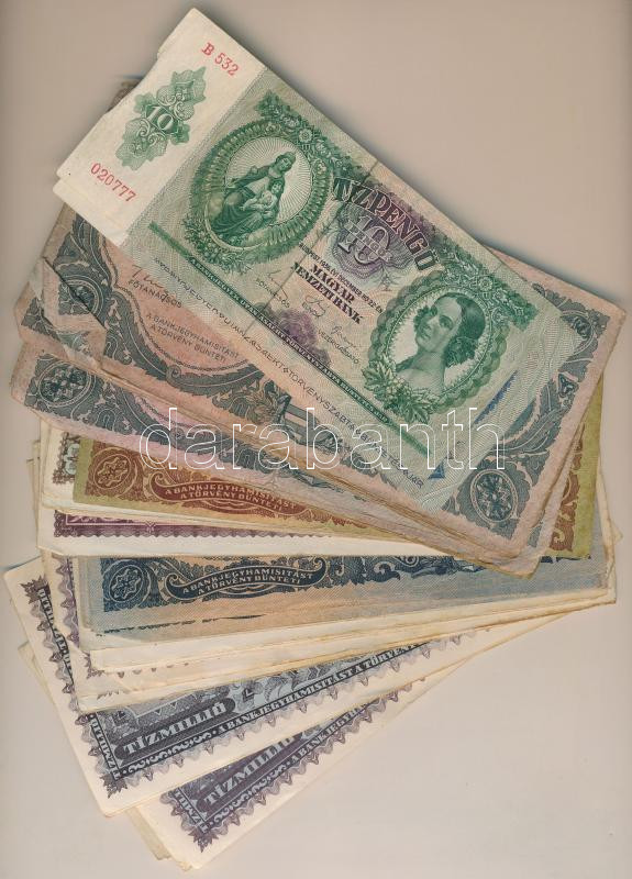 Leírás: 1936. 10P + 1941. 20P + 1945. 1000P (10x) "MNB" bélyeggel + 10.000P (5x) "MNB" bélyeggel + 100.000P (4x) + 1.000.000P + 1946. 100.000.000P + 1.000.000.000P (3x) + 10.000MP (8x) + 100.000MP + 1.000.000MP (7x) + 10.000.000MP (9x) + 100.000.000MP (6x) + 1.000.000.000MP (4x) + 100.000BP T:III