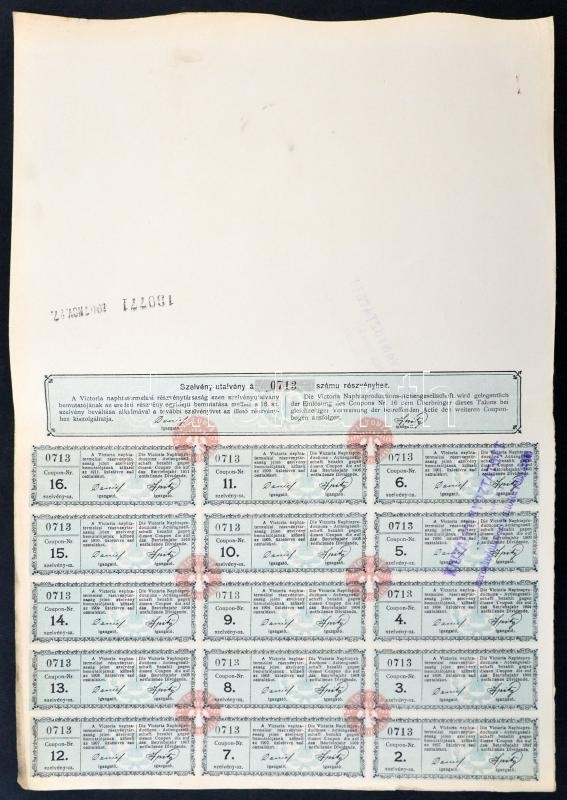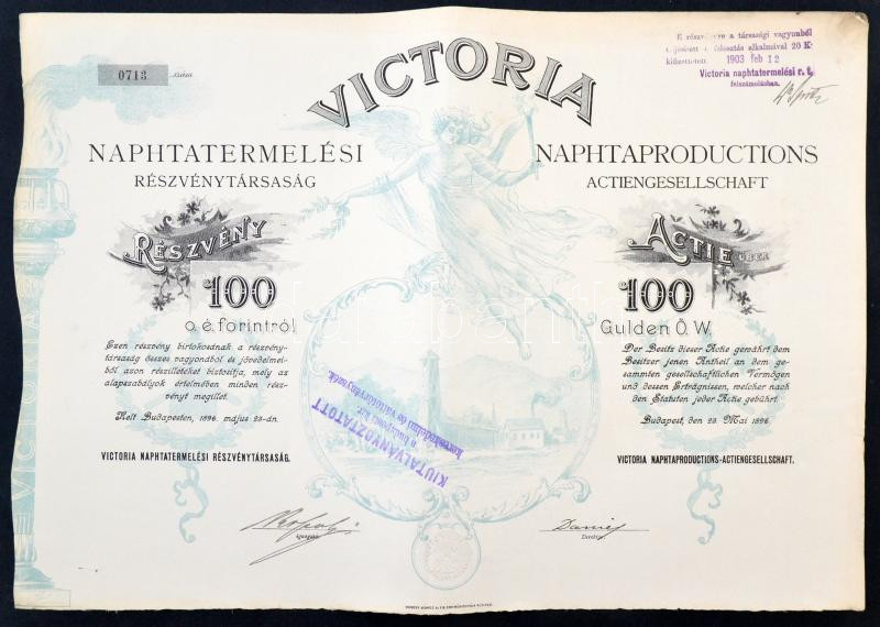 Budapest 1896. "Victoria Naphtatermelési Részvénytársaság" részvénye 100Ft-ról teljes szelvényívvel, felülbélyegzésekkel T:II-,III lyukak, apró szakadások