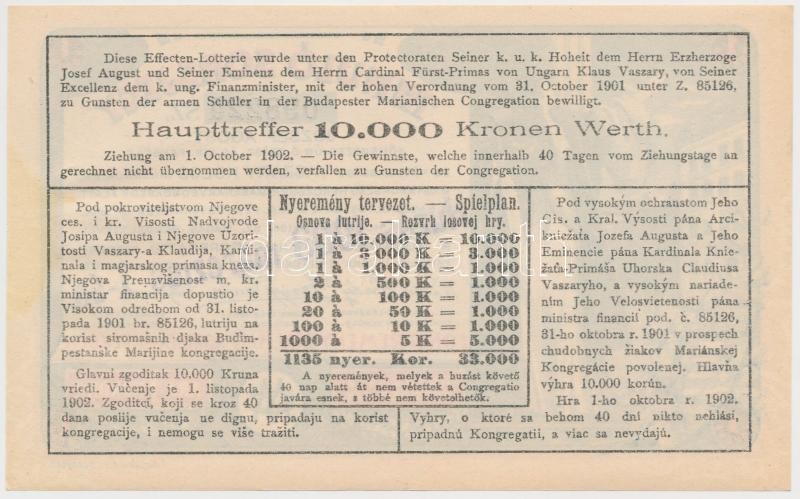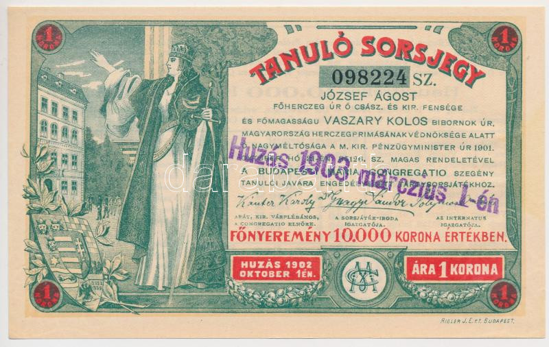 Leírás: Budapest 1903. "Tanuló Sorsjegy" 1K értékben, felülbélyegzéssel T:I- kis szennyeződés