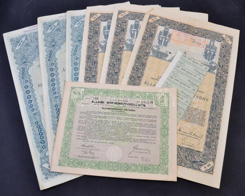 Leírás: Budapest 1915. "A Magyar Korona Országai 6%-kal kamatozó Járadékkölcsön" államadóssági kötvénye 100K-ról szelvényekkel, szárazpecséttel, bélyegzésekkel (3x) egy ugrással sorszámkövetőek + 1917. "A Magyar Korona Országai 6%-kal kamatozó Járadékkölcsön" államadóssági kötvénye 100K-ról szelvényekkel, szárazpecséttel, bélyegzésekkel (2x) közülük kettő sorszámkövető + 1941. "4%-kal kamatozó Állami Nyereménykölcsön" államadóssági kötvény 1/2 részkötvénye 100P-ről, szelvényekkel, szárazpecséttel + "Budapest-Krisztinavárosi Casino-épület részvénytársaság" 6db szelvénye és 1db szelvény utalványa részvény nélkül! T:II-III-