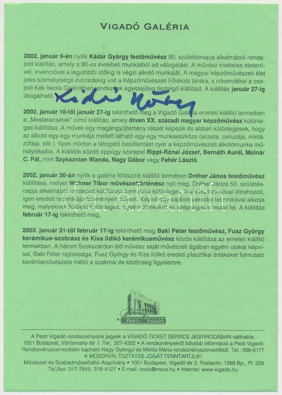 Leírás: 2002 Kádár György (1912-2002) festőművész aláírása a Pesti Vigadó programfüzetén