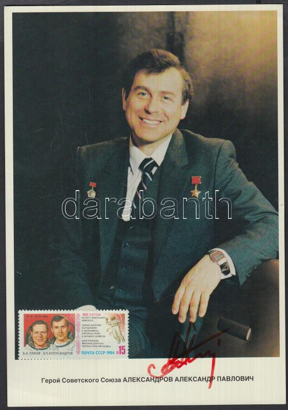 Alekszandr Alekszandrov (1943-) szovjet űrhajós aláírása őt magát ábrázoló bélyegzett fotólapon /