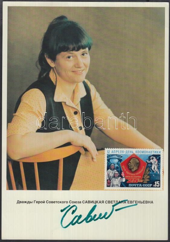Szvetlana Szavickaja (1948-) szovjet űrhajós aláírása őt magát ábrázoló bélyegzett fotólapon /