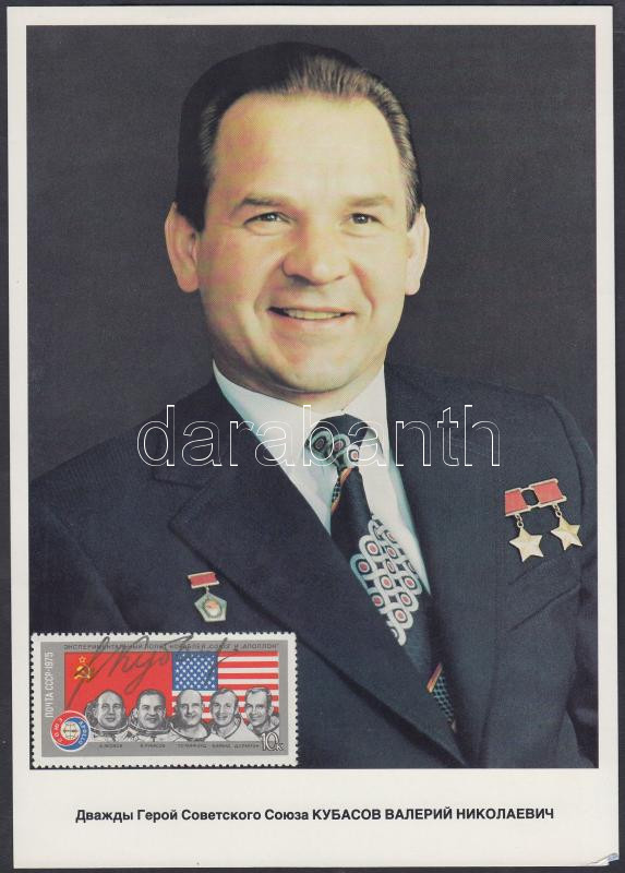 Valerij Kubaszov (1935-2014) szovjet űrhajós aláírása őt magát ábrázoló bélyegzett fotólapon /