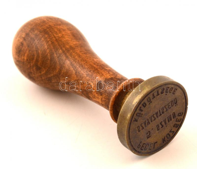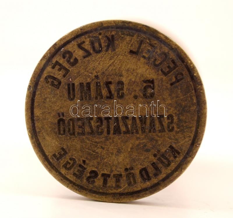 "Pécel község 5. számú szavazatszedő küldöttsége" feliratú réz pecsétnyomó fa fogóval, tetején a készítő adataival, a választóhelyiségek és urnák viaszpecsétes zárására, h: 9 cm