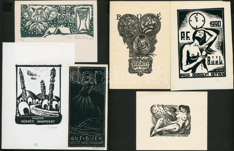 3 db erotikus ex libris ill. alkalmi kisgrafika különböző művészektől (Torró Vilmos, Drahos István, stb.), fametszet ill. klisé, papír, jelzettek a dúcon/klisén, különböző méretben + 3 db alkalmi kisgrafika különböző művészektől (Turi Tóth Tibor, Mottl Román Pál, Bánsági András), fametszet, papír, jelzettek, különböző méretben