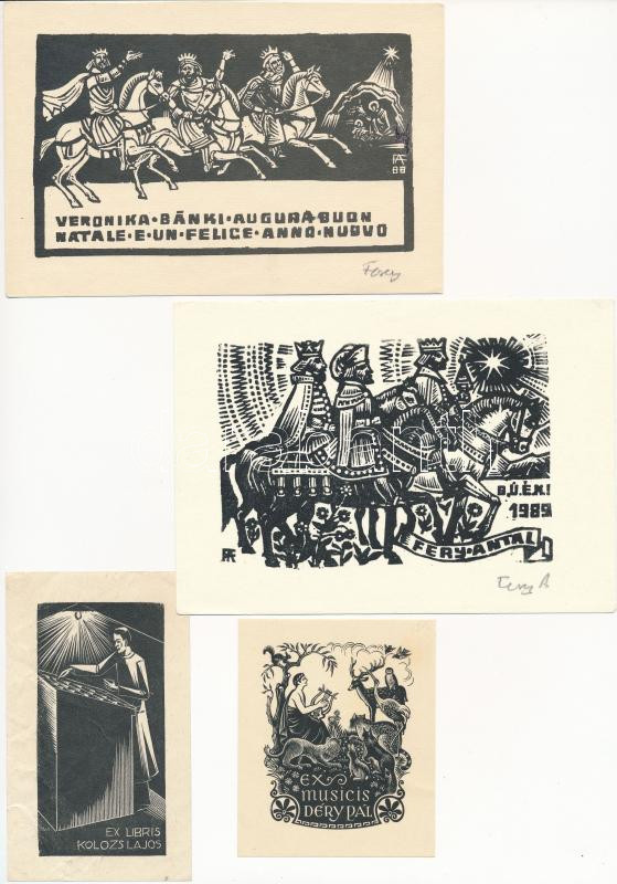 Drahos István (1895-1968): Ex libris ill. alkalmi grafika, 2 db, fametszet ill. klisé, papír, jelzettek a dúcon/klisén, különböző méretben + Fery Antal (1908-1944): 2 db alkalmi grafika, fametszet, papír, jelzettek, különböző méretben + Gáborjáni Szabó Kálmán (1897-1955): Ex libris, fametszet, papír, jelzett a dúcon, 8,5×4 cm + Ex libris musicis, klisé, papír, jelzés nélkül, 8×6,5 cm