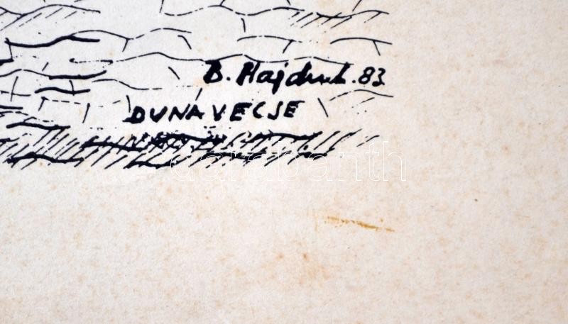 Leírás: B. Hajdu László (1926-): Dunavecse. Nyomat, papír, jelzett a nyomaton, 21×29 cm