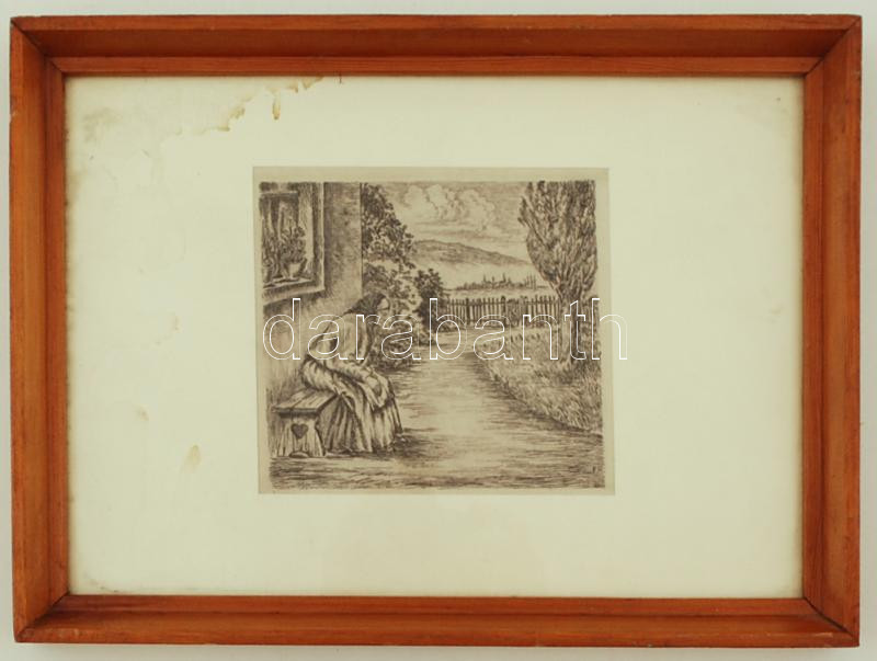 Leírás: F.R jelzéssel: Öregasszony. Tus, karton, üvegezett keretben, 14×15 cm