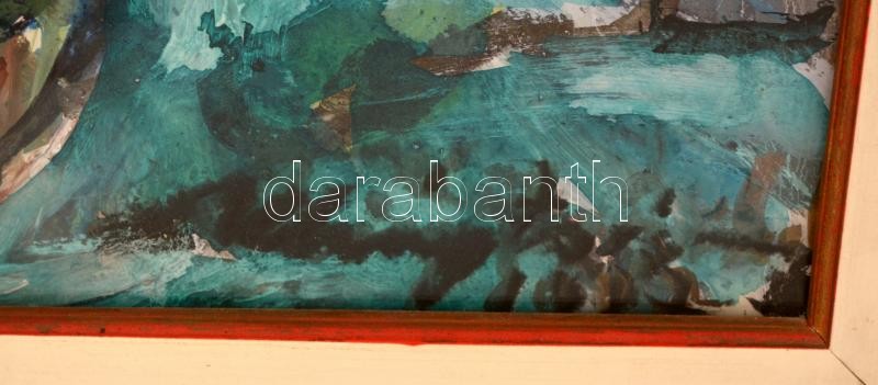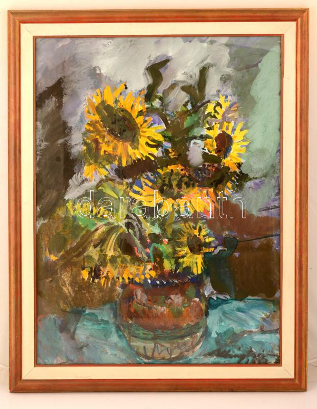 Leírás: Uhrig Zsigmond (1919-1993): Napraforgós csendélet. Olaj, farost, jelzett, üvegezett keretben, 60×80 cm