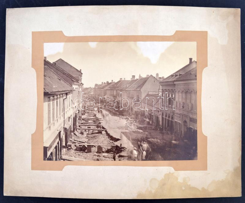 Leírás: 1878 Miskolc, útépítés a belvárosban nagyméretű, pecséttel és aláírással jelzett fotó. (Szinay Ferenc) (folttal) 40x32 cm
