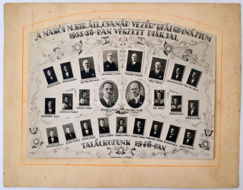 Leírás: 1936 Makó, Csanád vezér Reálgimnázium tanárai és végzett diákjai, kistabló 25 nevesített portréval, Homonnai műterméből, 19x25 cm, karton 25x32 cm